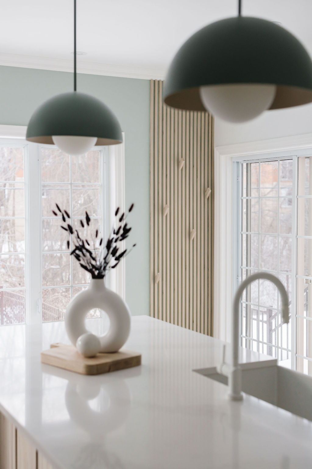 Lighting was an essential element of the project. The space features fixtures by Luminaire Authentik, a Quebec-based artisan known for exceptional craftsmanship and quality. Their warm, well-crafted lighting enhances textures and softens the space, creating an inviting atmosphere from day to night.