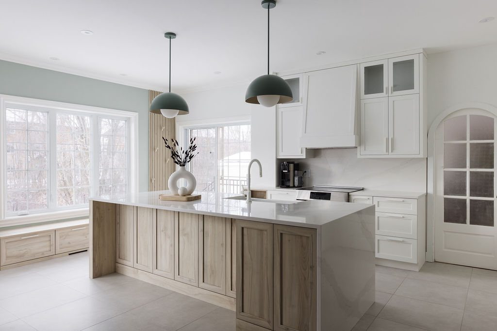 The kitchen and powder room were fully redesigned through a turnkey approach, led by Groupe Cartier. From the initial concept to the final installation, our team handled the interior design, custom kitchen production, installation, and full project management as general contractor.