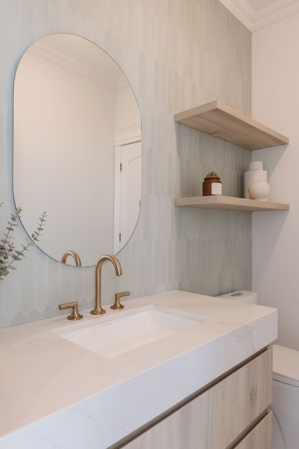 The powder room, more understated, was given the same level of care. Balanced proportions, refined finishes, and a calm aesthetic ensure visual continuity with the kitchen, free from unnecessary trends.