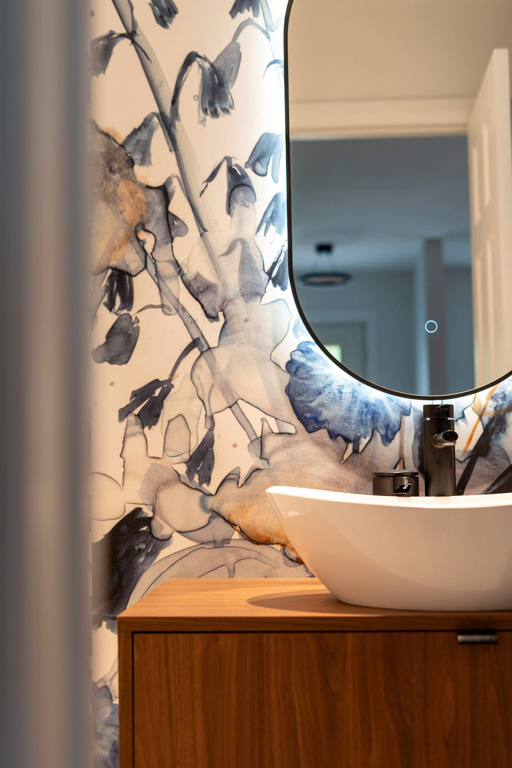 The powder room, though more compact, received the same level of care. Every detail—from custom cabinetry to finishes—was selected to maximize space while maintaining an elegant and calming ambiance that flows naturally from the kitchen.